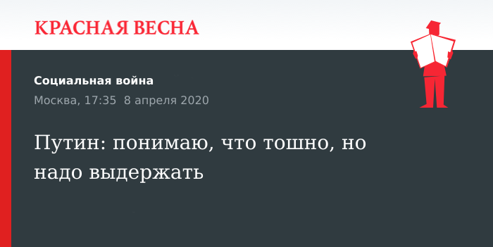 Путин сказал, обращаясь к гражданам России, что понимает, что уже накопилась усталость, серьезный груз финансовых, бытовых и других проблем. Нарушен привычный ритм жизни. По его словам, несмотря на то, что для большинства постоянное нахождение в четырех стенах в режиме самоизоляции — это «муторно и тошно», но выбора сейчас нет.