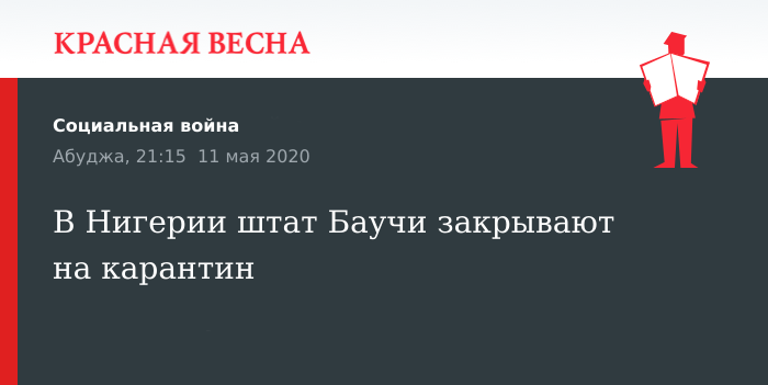 Из-за резкого роста коронавирусной инфекции в штате Баучи с 12 мая начнется десятидневный карантин. «В связи с ростом случаев заражения COVID-19 в штате Баучи будет введен режим карантина начиная с 12 мая 2020 года, сроком на 10 дней», — в своем Twitter написал губернатор штата Бала Мохаммед.
