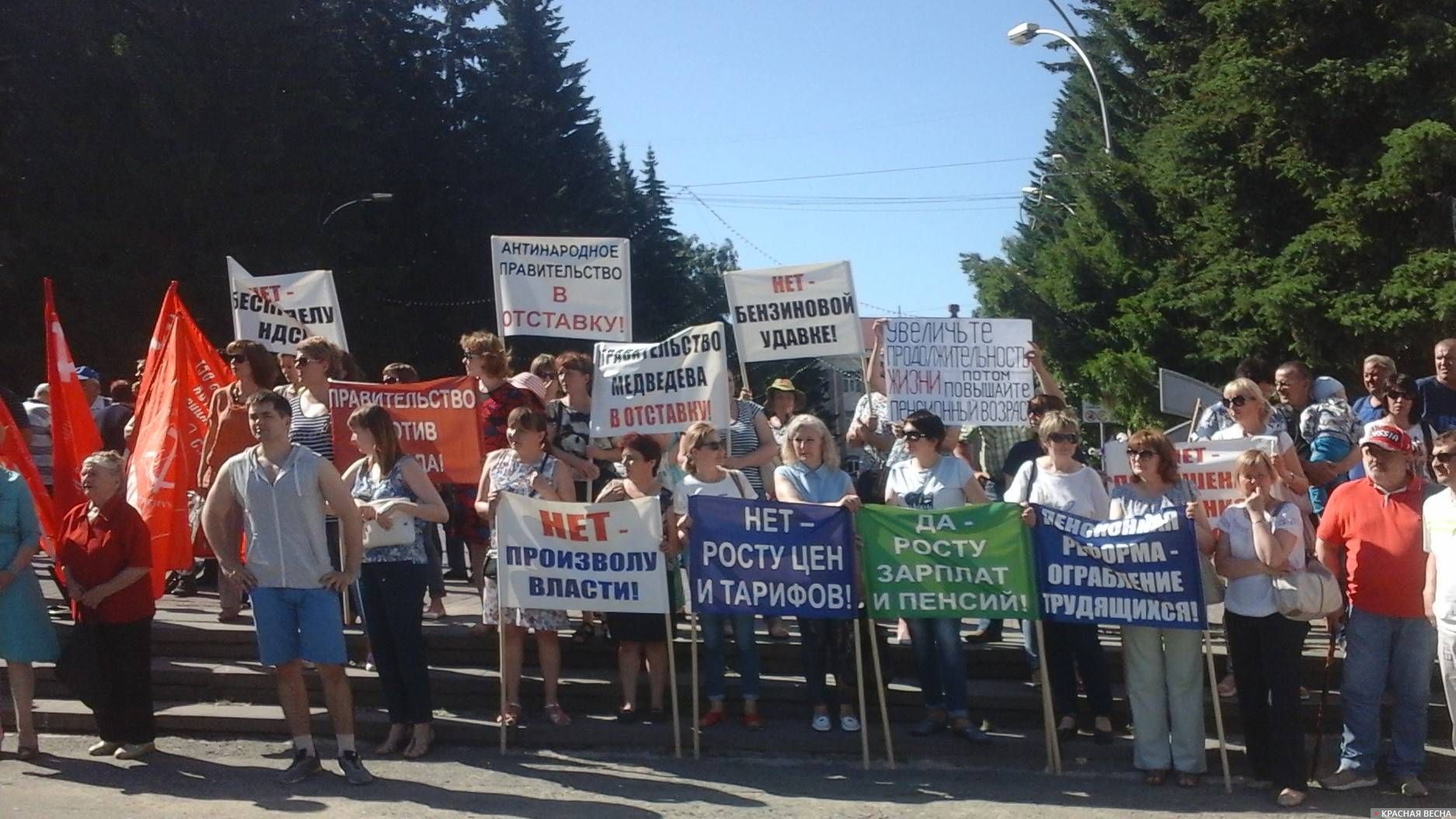 1 июля. На митинг против пенсионной реформы пришли представители КПРФ, «Яблока», «Команды Навального», РОТ-Фронта и других объединений, сообщает ИА Красная Весна. Митинг начался в 16:00 у кинотеатра «Россия». Всего митинг собрал порядка 500 человек. Несмотря на обилие красной символики, на митинге звучали лозунги сторонников Навального. Последние, наряду с партией «Яблоко», получили право выступать в основной части митинга.