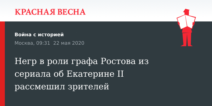 Российские зрители высмеяли новый сериал по историческим мотивам, посвященный российской императрице Екатерине II. Авторы пригласили на роли интернациональный состав актеров. Так фаворита императрицы играет индийский актер Саша Дхаван, а графа Ростова чернокожий актер из Англии Абрахам Попула. Интернет уже окрестил его «князем Ростовым из «Ростова-на-Конго».