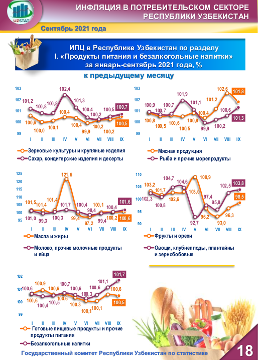 Согласно данным государственного комитета по статистике Узбекистана, в сентябре 2021 года мясо птицы подорожало на 1,9−2,8%, говядина и баранина подорожала на 1,8%. В целом с начала года цены на мясо и мясную продукцию выросли на 13,3%. На куриную голень и окорочка цены выросли на 13%, а на говядину с костями цены выросли на 10,3%, на баранину на 8,2%. Картофель за сентябрь подорожал на 7,8%.