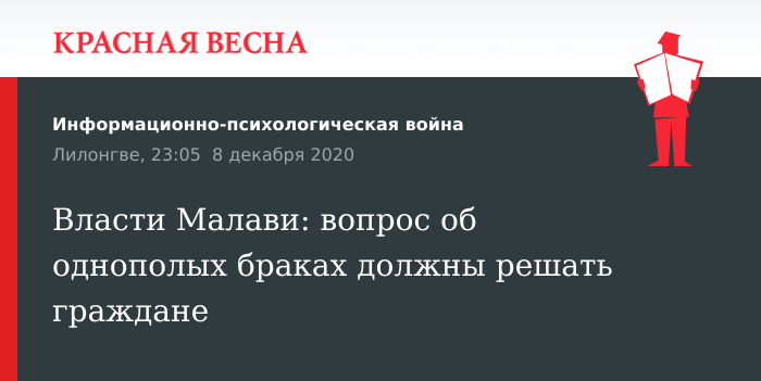 Вопрос о легализации однополых браков в Малави должны решать граждане страны, поскольку у президента Лазаруса Чакверы нет по этому поводу четкой позиции, заявил пресс-секретарь главы государства Брайан Банда 8 декабря, сообщает информагентство Nyasa Times.