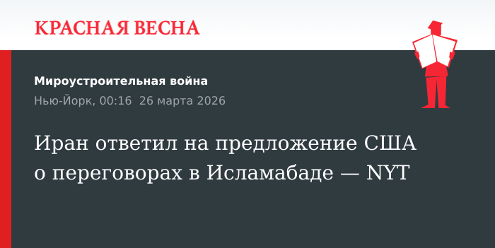 Власти Ирана рассматривали возможность проведения переговоров с США в Исламабаде, но позднее отклонили американские предложения, 25 марта со ссылкой на иранские источники сообщает газета The New York Times (NYT).