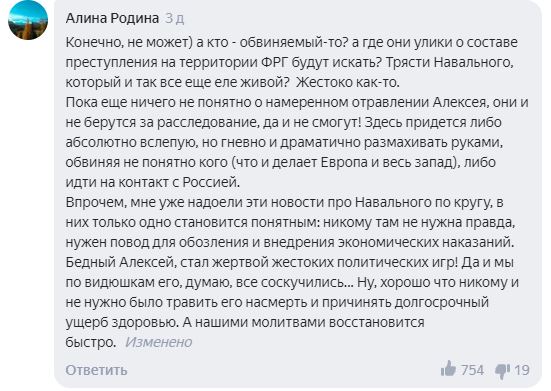 Странное поведение Германии по делу Навального отметили комментируя новость, что власти Германии пытались инициировать расследование по Навальному, пользователи Сети, включая сторонников Навального, 25 сентября комментарии пользователей были опубликованы на новостном агрегаторе «Яндекс.Новости».