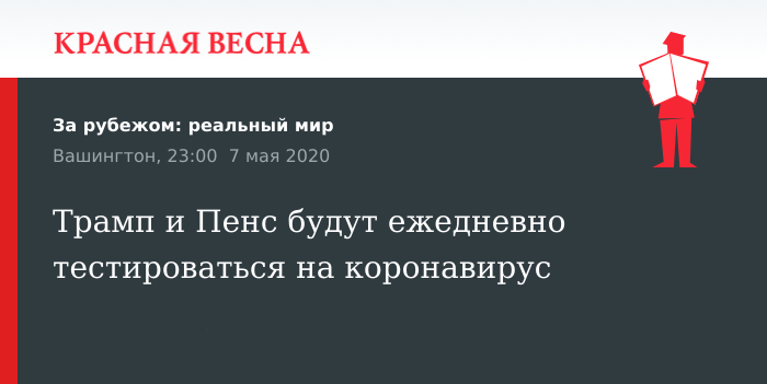 Ежедневное тестирование на коронавирус будут проходить президент США Дональд Трамп и вице-президент Майкл Пенс, заявил Пенс 7 мая на брифинге в Белом доме, сообщает Reuters.