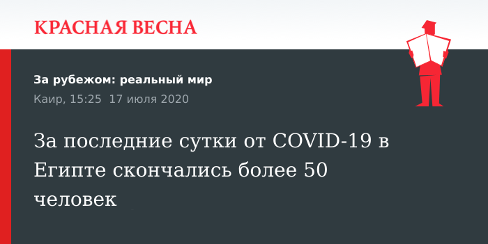 В общей сложности 53 жителя Египта умерли в результате заболевания COVID-19 за последние 24 часа, говорится в сообщении министерства здравоохранения страны, 17 июля сообщает агентство Анадолу.
