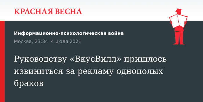 Извинения за публикацию статьи, героями которой стали члены однополой семьи, пришлось принести представителям сети магазинов «ВкусВилл», соответствующее сообщение появилось 4 июля на странице, где ранее находилась статья.