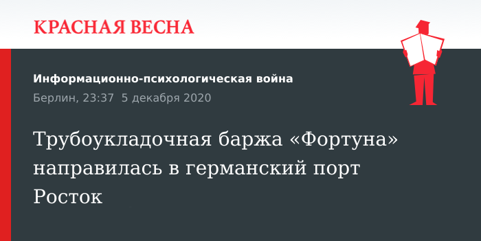 Баржа «Фортуна», находящаяся в Балтийском море в статусе «ограниченная маневренность», в 9:40 по местному времени вышла из порта Висмар, чтобы продолжить строительство трубопровода «Северный поток — 2» в районе мелководья Алдергрунд.