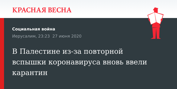 Повторная вспышка COVID-19 зарегистрирована в ряде городов на Западном берегу реки Иордан, в связи с чем в регионе объявлен карантин, 27 июня сообщает информационное агентство Maan.