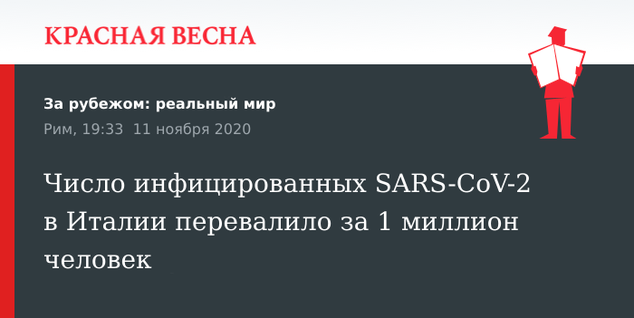 Общее число случаев заболевания COVID-19, зарегистрированных в Италии с начала пандемии, превысило отметку в один миллион человек, говорится в сообщении министерства здравоохранения страны 11 ноября, сообщает агентство Reuters.