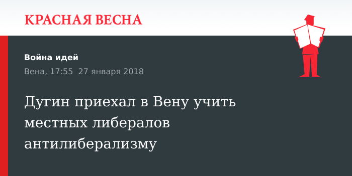 Лекция, посвященная проблемам либерализма в нынешнем мире, прошла в Вене. Организатором выступил либертарианец Томас Баххаймер, который пригласил для этой цели Александра Дугина. Об этом сообщает 26 января австрийская газета Wiener Zeitung.