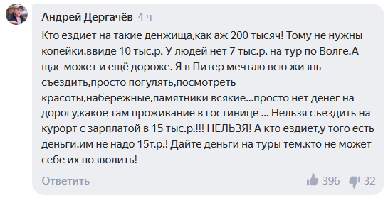 Пользователи Сети прокомментировали инициативу правительства РФ по поддержке внутреннего туризма. Согласно новому постановлению российские туристы получат денежную субсидию от 5 до 15 тысяч для частичной компенсации расходов на поездки внутри страны. Правительство РФ выделило на эти цели 15 миллиардов рублей.