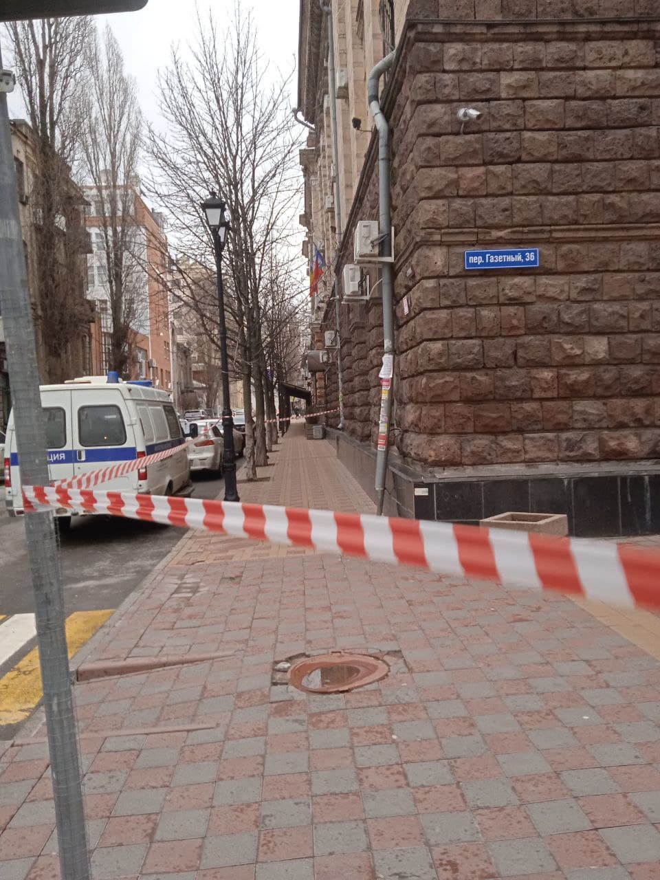 Оцеплено и опоясано заградительной лентой здание Кировского райсуда города Ростова-на-Дону в переулке Газетном. По периметру дежурят сотрудники силовых ведомств и спецавтотранспорт.