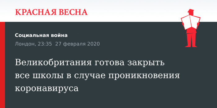 Школы должны быть закрыты, а массовые мероприятия приостановлены на два месяца в случае начала распространения коронавируса в стране, заявил главный врач Англии Крис Уитти 27 февраля, написала The Times.