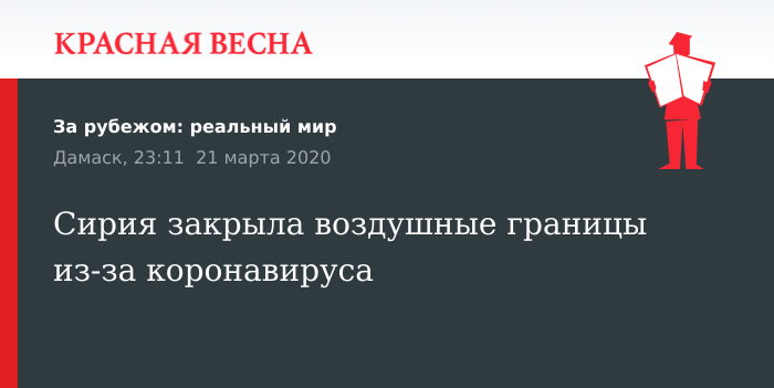 По его словам, Сирия полностью закрывает воздушные границы, чтобы не допустить проникновения вируса в страну. Последний авиарейс в Сирию прибудет из Москвы 22 марта, после чего границы полностью закроют.