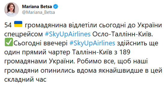 «54 гражданина Украины улетели сегодня в Украину спецрейсом SkyUpAirlines Осло-Таллинн-Киев. Сегодня вечером SkyUpAirlines осуществит еще один прямой чартер Таллинн-Киев с 189 гражданами Украины. Делаем все, чтобы наши граждане оказались дома как можно быстрее в это сложное время», — написала Беца.