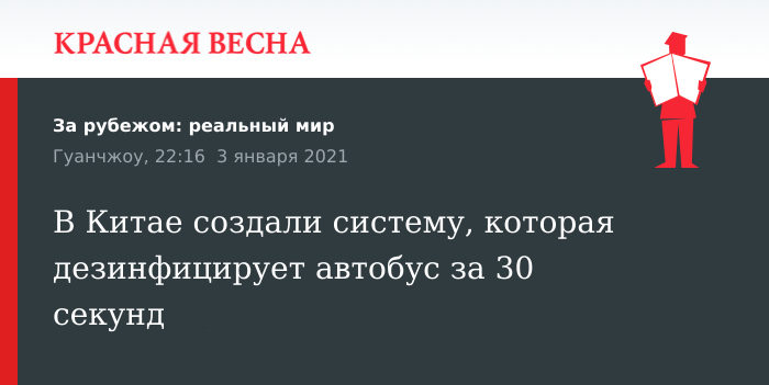 «Система распылительной дезинфекции для предотвращения эпидемий в общественном транспорте», позволяющая автоматически дезинфицировать пассажирский автобус или троллейбус за 30 секунд нажатием одной кнопки, была запущена в Гуанчжоу, 2 января сообщает китайское информационное агентство China News.