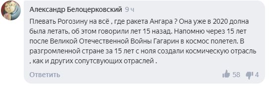 Пользователь Александр Белоцерковский припомнил Рогозину проект «Ангара», которые двигается с большим трудом.