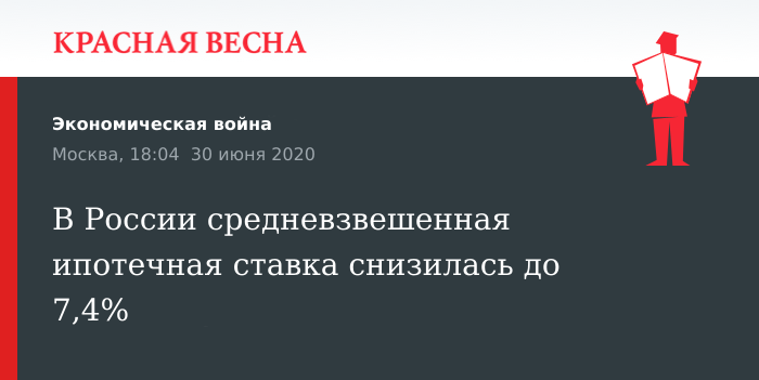 Средневзвешенная ставка по ипотечным кредитам, выданным в мае 2020 года, снизилась до 7,4%. Об этом 30 июня сообщает Банк России.