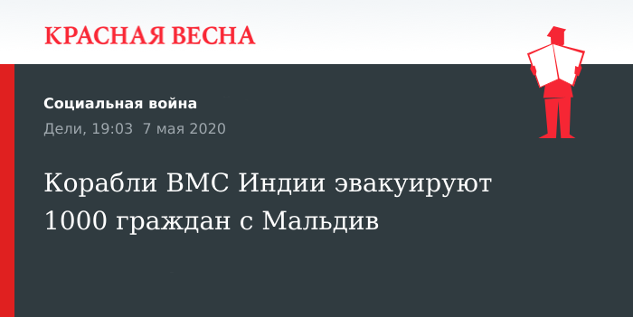 Два корабля были отправлены военно-морскими силами (ВМС) Индии для эвакуации 1000 граждан с Мальдивских островов, 7 мая пишет газета Hindustan Times.