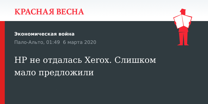 Напомним, это не первое предложение Xerox, отвергнутое HP. В ноябре 2019 года Xerox предлагала 33 млрд долларов. Руководители Hewlett-Packard усомнились в способности Xerox привлечь необходимые средства. В январе 2020 года оценка рыночной стоимости HP составляла 30 млрд, что в четыре раза больше стоимости самой Xerox. Последняя договорилась с банками о привлечении средств и сделала HP новое предложение.