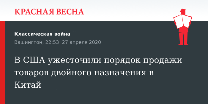 Правительство США ужесточает требования к процедуре выдачи лицензий на экспорт американского оборудования двойного назначения в КНР, сообщили в Бюро промышленности и безопасности Министерства торговли США 27 апреля.