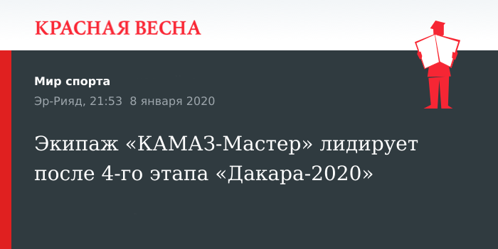 Экипаж россиянина Андрея Каргинова «КАМАЗ-Мастер» победил в общем зачете ралли «Дакар-2020» после завершения 4-го этапа гонки, 8 января сообщает издание INTERFAX.RU.