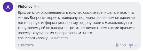 Жаркие споры вызвало сообщение о том, что врачи омской больницы скорой помощи 44 часа боролись за жизнь политика, у сторонников Алексея Навального и других пользователей Сети, 26 августа комментарии пользователей были опубликованы на новостном агрегаторе «Яндекс.Новости».