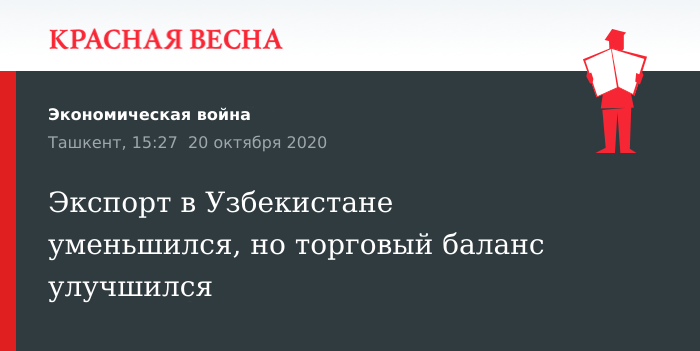 Так как объем импорта сократился еще сильнее, на $3,4 млрд, то общий торговый баланс Узбекистана улучшился на 35%. Общий объем экспорта достиг $12,9 млрд, импорта — $16,1 млрд.