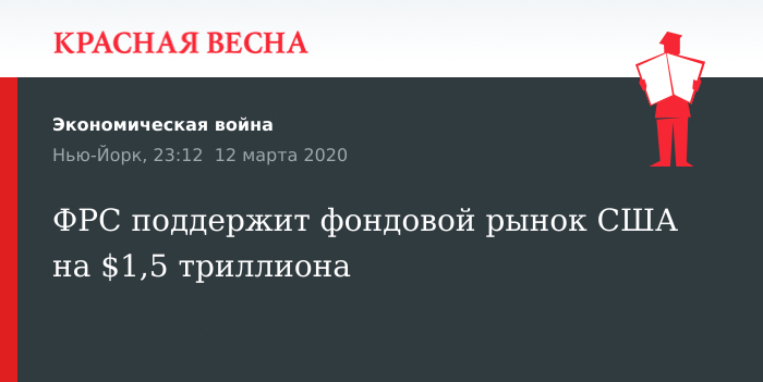 12 марта пройдет первый аукцион на $500 млрд на трехмесячные сделки репо, а 13 марта рынку будут предоставлены $500 млрд для одномесячного репо и еще $500 млрд для трехмесячного.