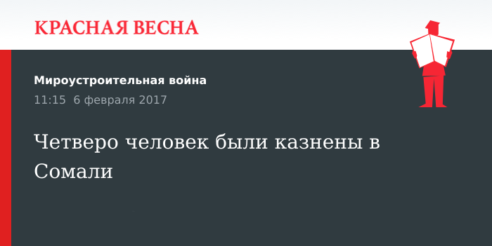 Четверо человек были обезглавлены боевиками исламистской группировки «Аль-Шабаб» в Сомали 6 февраля. Об этом сообщил глава группировки «Аль Шабаб» в регионе Джубба Мухамед Абу Абдалла корреспонденту Рейтер.
