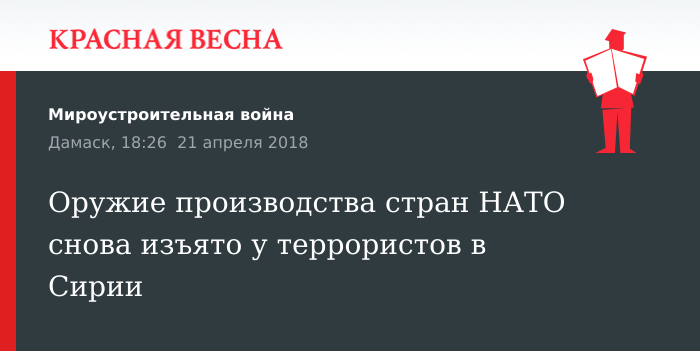 Напомним, оружие, произведенное в США и других странах НАТО, регулярно изымается при освобождении от террористических группировок сирийских городов. Так, во время зачистки Дейр-эз-Зора в октябре 2017 года начальник Главного оперативного управления сирийской армии дивизионный генерал Али Аль-Али заявил о поставках с июня по сентябрь 2017 года 1421 грузовика с американским вооружением, которое попало в руки террористических группировок.