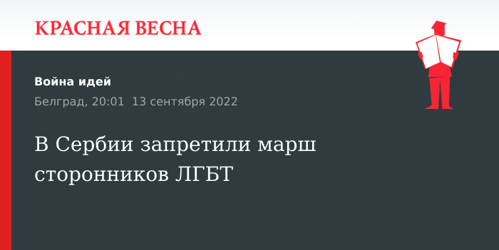Министерство внутренних дел Сербии запретило проводить ЛГБТ-манифестацию EuroPride-2022, сообщает 13 сентября пресс-служба ведомства.