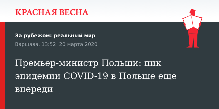 Польские власти ждут еще несколько тысяч случаев заражения коронавирусом, заявил премьер-министр Польши Матеуш Моравецкий 20 марта в интервью каналу CNN.