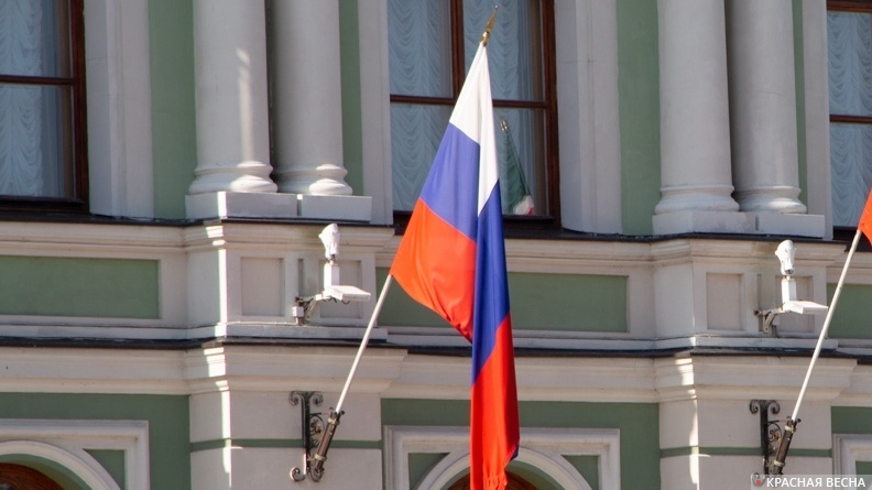 Кроме флага России рядом также висят флаги Перу, Бельгии и Республики Корея.