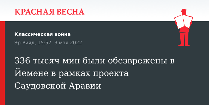 335 893 наземных мин в Йемене, заложенных ополченцами хуситов, были обезврежены по программе правительства Саудовской Аравии, 3 мая пишет Arab News.