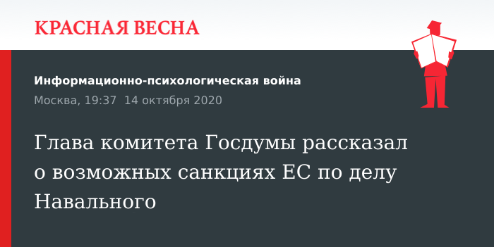 Попыткой под очередным надуманным предлогом подвести под санкции тех, кто под них не попал ранее, назвал возможное введение ЕС санкций против ряда российских политиков и руководителей ведомств в связи с инцидентом с «отравлением» Алексея Навального, глава комитета Госдумы по международным делам Леонид Слуцкий. Такое заявление политик сделал 14 декабря журналистам.
