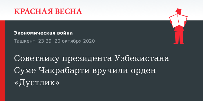 «19 октября текущего года в Министерстве инвестиций и внешней торговли состоялась церемония вручения ордена „Дустлик“ Суме Чакрабарти», — сообщает пресс-служба.