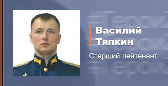 Мужество и профессионализм старшего лейтенанта Василия Тяпкина, поднявшегося в атаку на неонацистов во главе своего отряда, позволило отбросить противника с занимаемых позиций и освободить населенный пункт в ходе выполнения спецоперации по освобождению Донбасса и денацификации Украины. Об этом 18 августа сообщила пресс-служба Минобороны РФ.