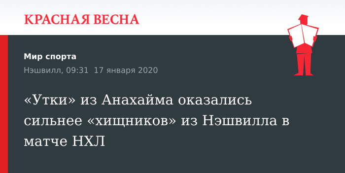 Отметим, обе команды находятся вне зоны плей-офф. У «Анахайма» 41 очко в 47 играх. «Нэшвилл» набрал 49 очков в 46 матчах.