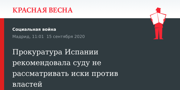 Прокуратура Испании порекомендовала Верховному суду страны вернуть истцам все иски, поданные против правительства Испании в связи с плохим управлением во время пандемии коронавируса, 14 сентября передал телеканал La Sexta.
