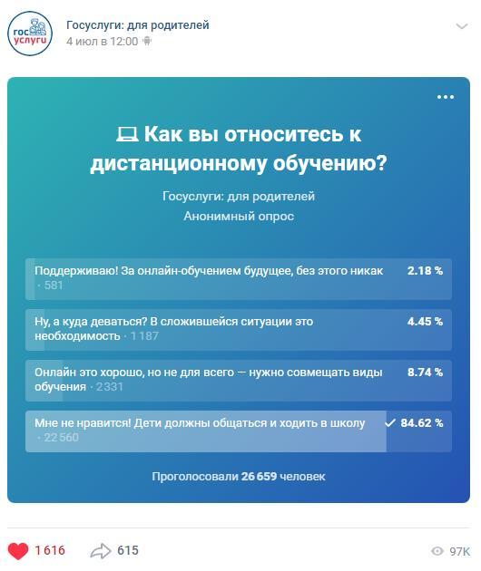 На официальной странице портала «Госуслуги», предназначенной для сообщений обо всех видах господдержки для российских родителей, 4 июля появился анонимный опрос. Администраторы группы предложили подписчикам ответить на вопрос: «Как вы относитесь к дистанционному обучению?». По состоянию на 23 часа 8 июля в опросе поучаствовали 26 659 человек.