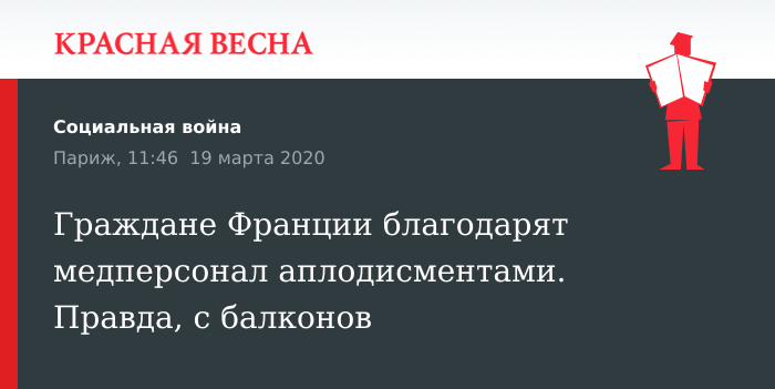 Вдохновленные примером своих итальянских и испанских соседей, граждане Франции вот уже второй вечер ровно в 20:00 дают рандеву для выражения признательности тем, кто находится день и ночь на переднем крае борьбы с опасной инфекцией — врачам, медсестрам, санитарам, работникам скорой помощи.