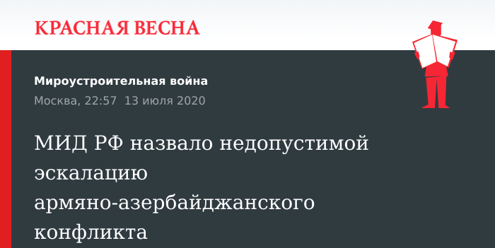 В опубликованном заявлении МИД России выразило «серьезную озабоченность резким обострением ситуации на армяно-азербайджанской границе», которая произошла 12 июля.