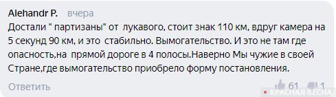 Alehandr P. считает повышение штрафов узаконенными поборами: «Достали „партизаны“ от лукавого, стоит знак 110 км, вдруг камера на 5 секунд 90 км, и это стабильно. Вымогательство. И это не там где опасность, на прямой дороге в 4 полосы. Наверно Мы чужие в своей Стране, где вымогательство приобрело форму постановления».
