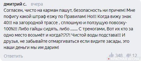 Дмитрий с. поддержал пользователя АОМ и вспомнил распространенную ситуацию на дороге, когда инспекторы сидят в «засаде»: «Согласен, чисто на карман пашут, безопасность ни причем! Мне пофигу какой штраф езжу по Правилам! Но!!! Когда вижу знак 40!!! на загородной трассе, сплошную и ползущую повозку- 100%!!! Либо гайцы сидять, либо..... С треногами, Вот их кто за одно место возьмёт и когда??!! Чистой воды подстава!!! И друзья, не забывайте осматриваться если видите засады, это наши деньги мы им дарим!»