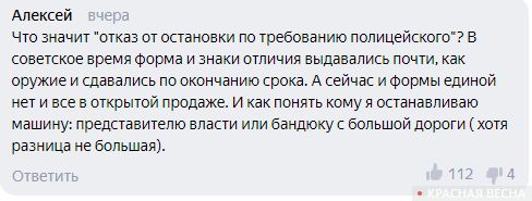 Алексей обратил внимание на формулировку «отказ от остановки по требованию полицейского»: «Что значит „отказ от остановки по требованию полицейского“? В советское время форма и знаки отличия выдавались почти, как оружие и сдавались по окончанию срока. А сейчас и формы единой нет и все в открытой продаже. И как понять кому я останавливаю машину: представителю власти или бандюку с большой дороги (хотя разница не большая)».