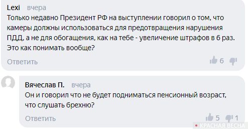 Lexi вспомнил слова Владимира Путина: «Только недавно Президент РФ на выступлении говорил о том, что камеры должны использоваться для предотвращения нарушения ПДД, а не для обогащения, как на тебе — увеличение штрафов в 6 раз. Это как понимать вообще?»