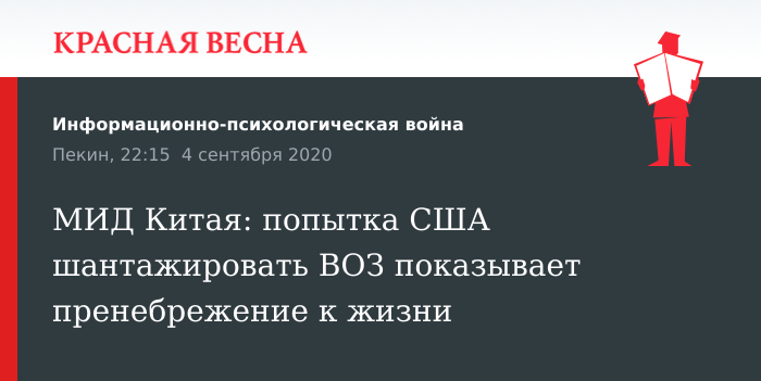 Перед лицом коронавирусной пандемии любая попытка продавить или шантажировать ВОЗ является пренебрежением к жизни, вызовом человечеству и разрушением международного противоэпидемического сотрудничества, заявила официальный представитель министерства иностранных дел Китая Хуа Чуньин, 4 сентября сообщает Синьхуа.