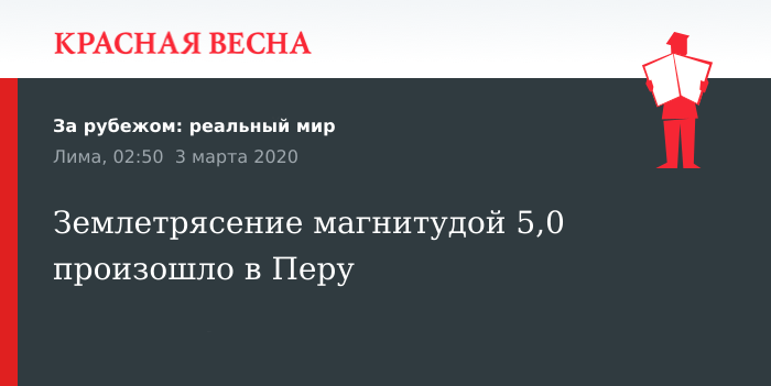 Землетрясение магнитудой 5,0 произошло 2 марта на юге Перу, сообщает Европейский средиземноморский сейсмологический центр.